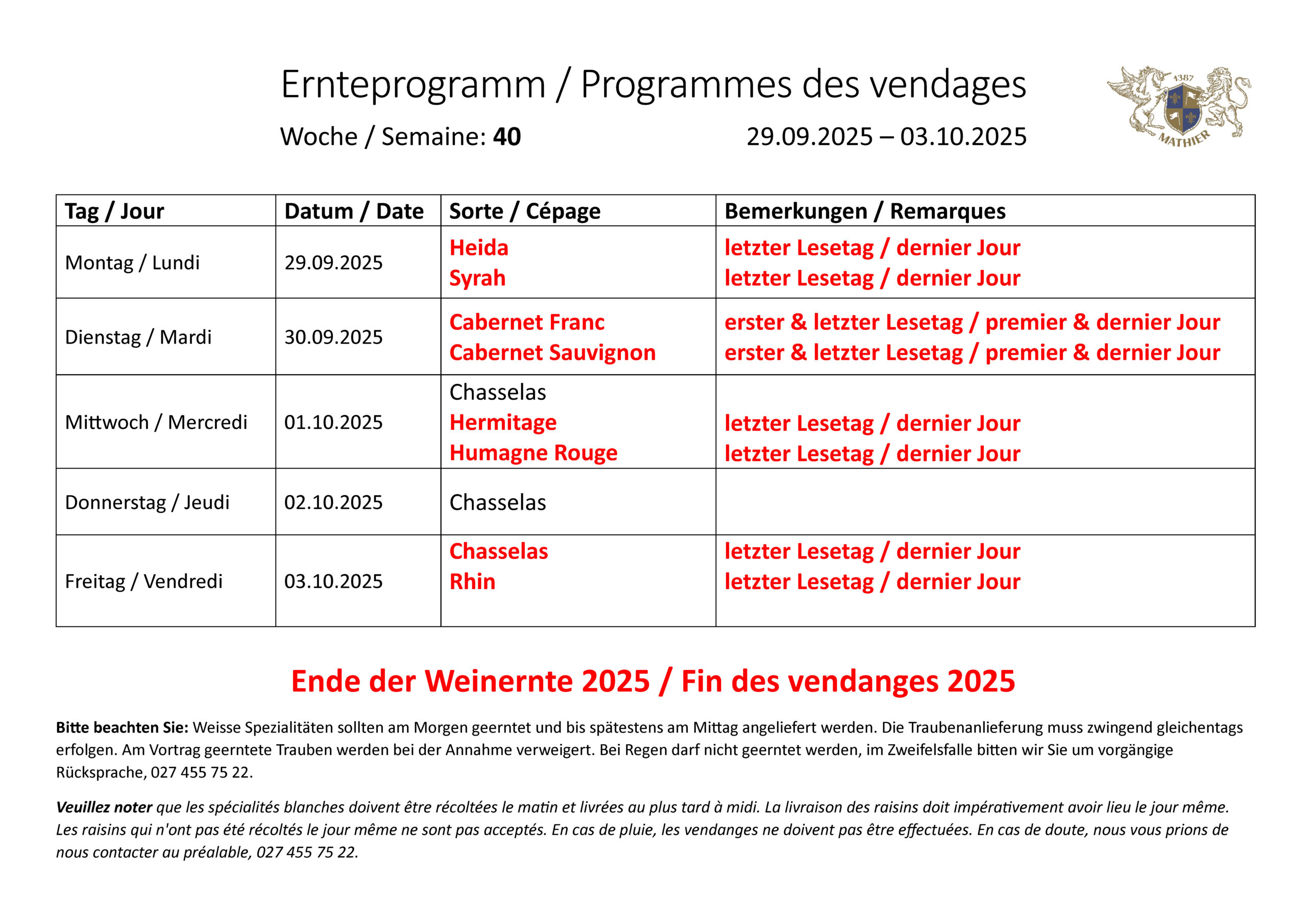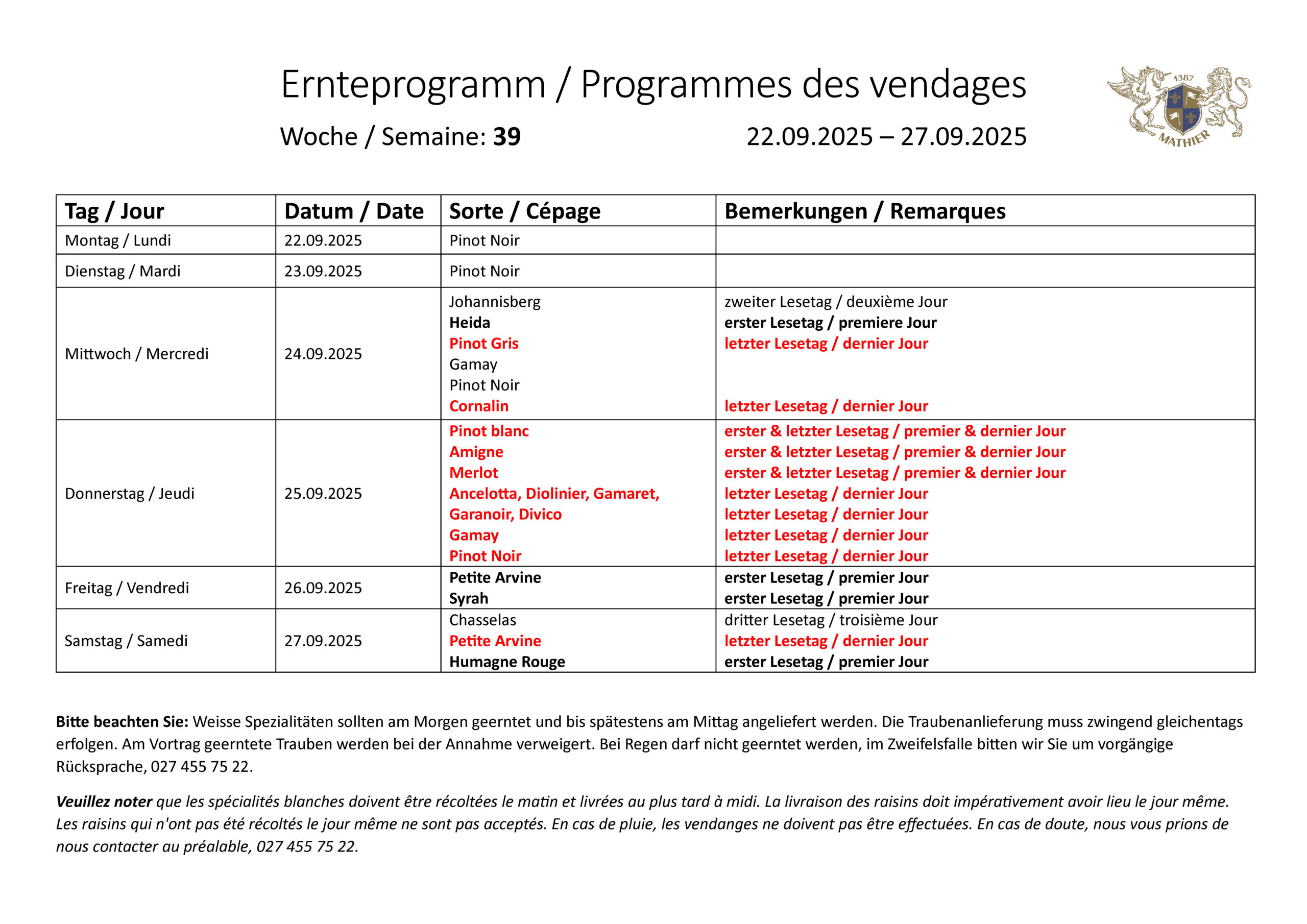 The harvest program is published on Fridays for the coming week. Supplying winegrowers can also find the harvest program in the Mathier app under Newscenter or by calling 027 455 95 93.